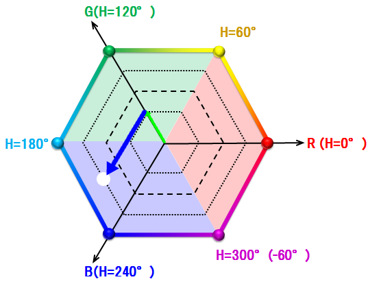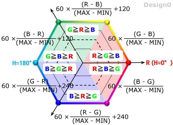 色相 H = 60 × ((R - G) ÷ (MAX - MIN)) +240°